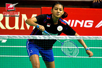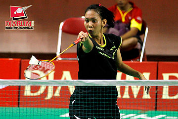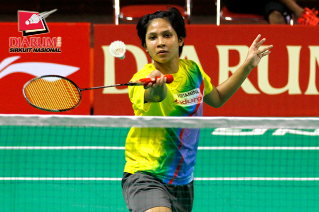 Ganis Nurrahmandani (Pertamina Indonesia) mengembalikan shuttlecock ke arah Tike Arieda (Jaya Raya Suryanaga).