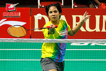Linda Mutiara (Mutiara Bandung) berusaha menggapai pengembalian shuttlecock dari Devi Yunita Indah (PB Djarum).