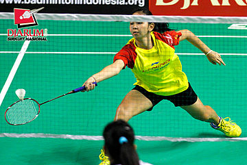 Devi Yunita Indah (PB Djarum) berusaha menggapai pengembalian shuttlecock dari Linda Mutiara (Mutiara Bandung).