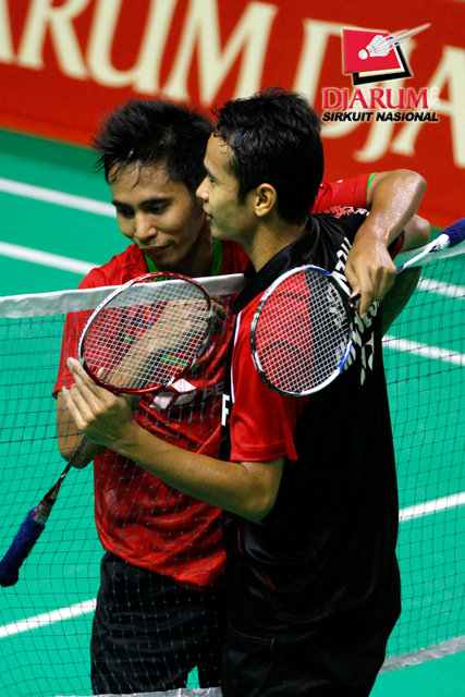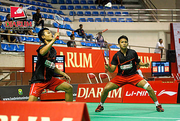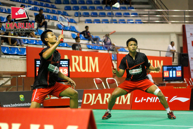 Abu Bakar/Tedi Supriadi (PB Djarum) menyambut serve dari Akbar Bintang/Kevin Ersa (PB Djarum).