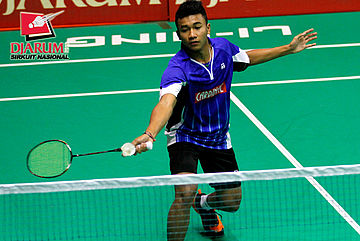 M. Shulton Al-Hakim (Mutiara Bandung) bersiap menyambut serve dari Eska Rivan Jaya (Mutiara Bandung).