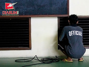 Seorang pekerja saat merapihkan kabel di GOR Hevindo.
