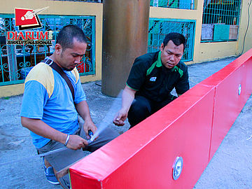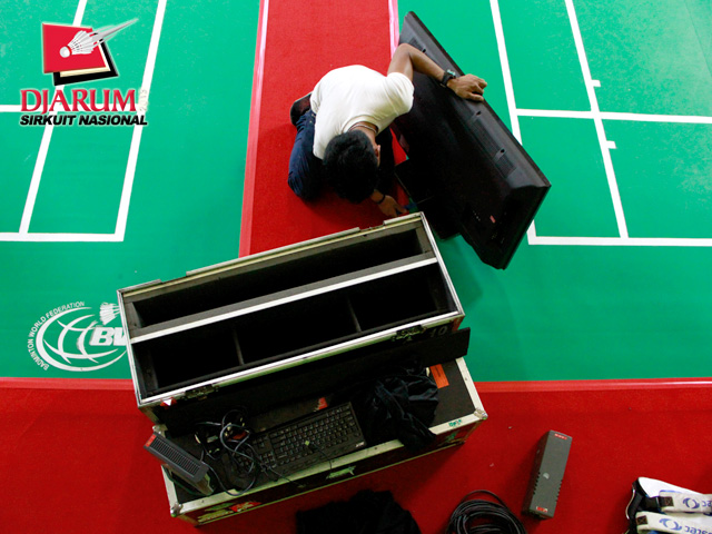 Salah seorang pekerja sedang memasang LCD Scoring di sisi lapangan GOR Hevindo, Balikpapan.