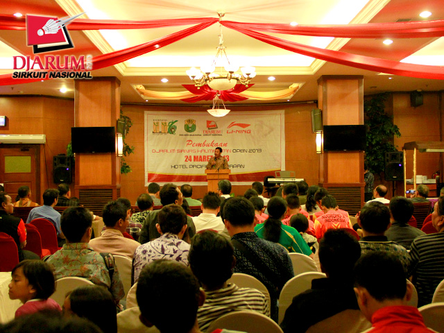 Suasana Hotel Pasifik saat Ketua DPRD Provinsi Kalimantan Timur, H.M. Mukmin Faisyal memberikan sambutan sebelum membuka Djarum Sirnas Kaltim Open 2013.