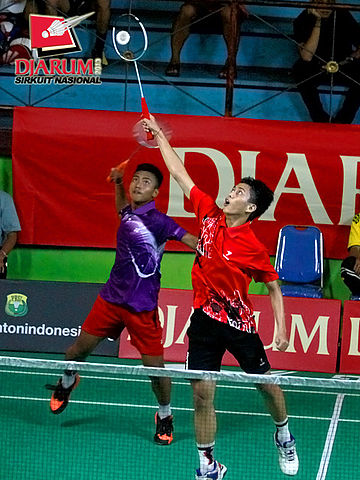 Hasriyadi/Saleh (D Ten's) melepaskan smash keras ke arah pasangan Andi/Hendra (Hevindo).