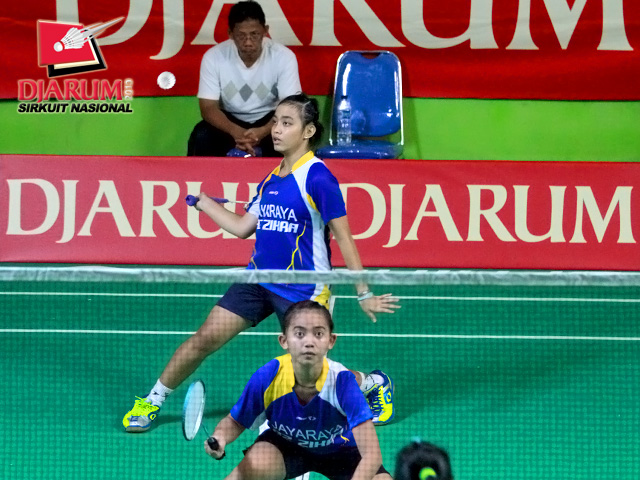 Aliana Kurniawati/Thalia Clara (PB Djarum) melepaskan smash keras ke arah pasangan Indah/Tessa (Berkat Abadi).