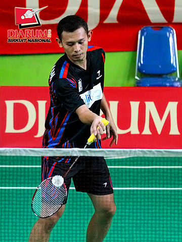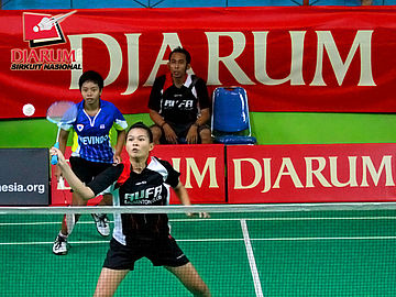 Wisnu Hemindya (Surya Baja) berusaha mengembalikan kok ke arah Jeffer Rosobin (Rosobin).