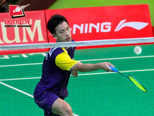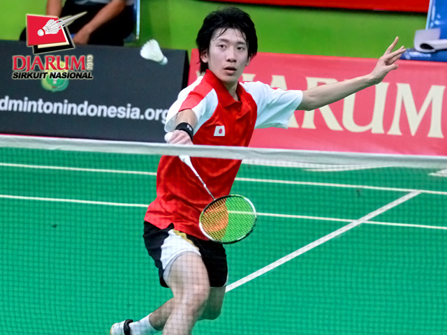 Hiraku Kobutoya (Hitachi Jepang) menyambut pengembalian kok yang dilepaskan Rafael Valentio (Hevindo).
