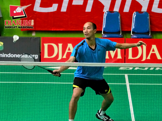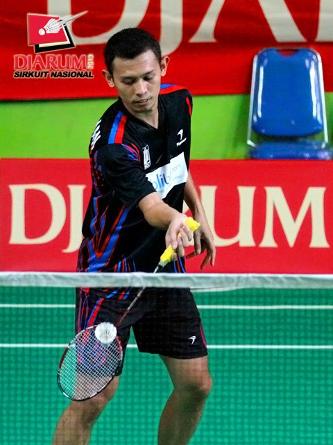 Jeffer Rosobin (Rosobin) berusaha mengembalikan kok ke arah Wisnu Hemindya (Surya Baja).