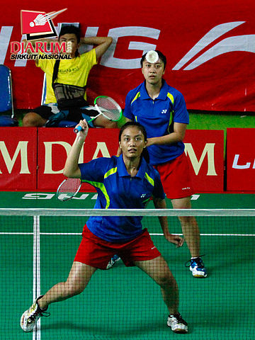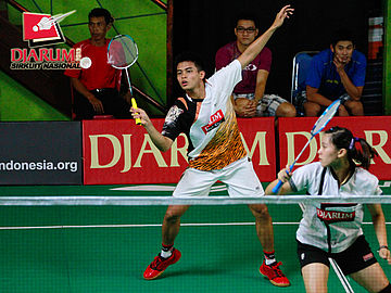 Sigit Sudrajad/Nurbeta Kwanrico (PB Djarum) bersiap mengembalikan kok ke arah pasangan Nugroho/Tieke Arieda (Jaya Raya Suryanaga).