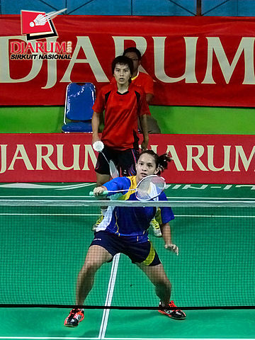 Febriani Endar/Ristya Ayu (PB Djarum) bersiap menyambar pengembalian tanggung dari Fisita/Puteri (Hi Qua Wima/Surya Baja).