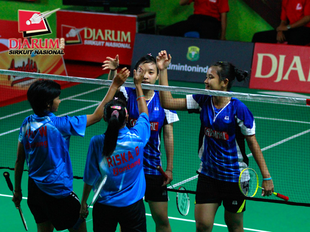 Masita Mahmudin/Afni Fadilah (Pusdiklat Jaya Raya/Indocafe) mengembalikan kok ke arah Anisa Nur Azizah/mita Sani (Pusdiklat Pikiran Rakyat).