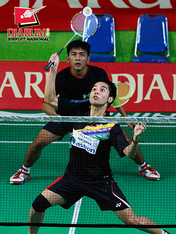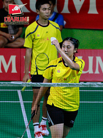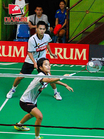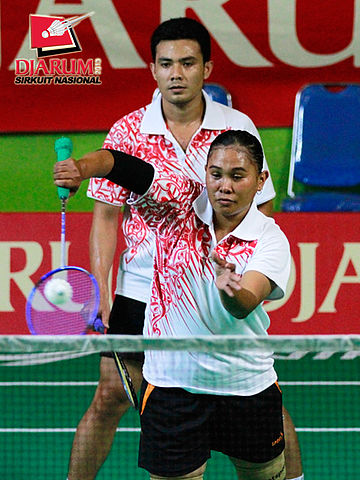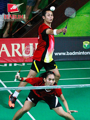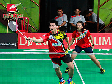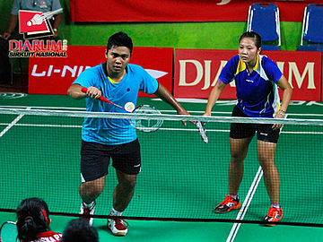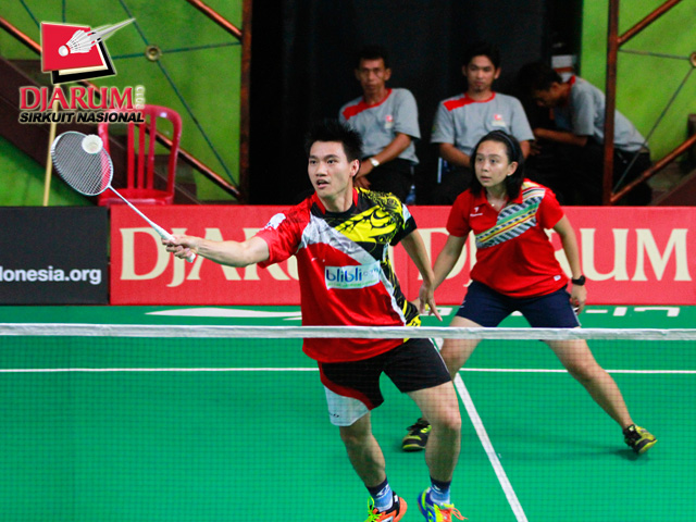 Abu Bakar/Febriani Endar (PB Djarum) menyambar pengembalian tanggung dari Egi Septian/Dini Fitri (SGS PLN).