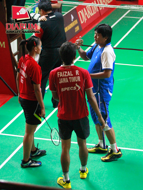 Faizal/Illa Alvionitasari (Jaya Raya Suryanaga) mendapatkan pengarahan dari pelatih saat jeda set pertama.