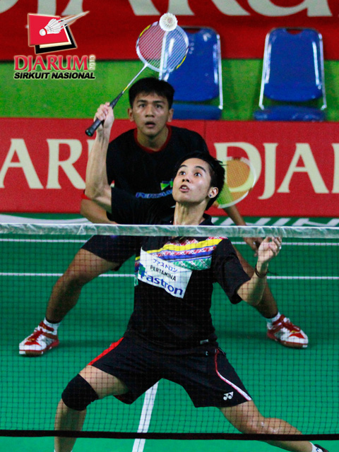 Nur Wahid/Eri Octaviana (Jaya Raya Suryanaga/Pusdiklat Jaya Raya) menyambut serve dari Rahmat Adianto/Deariska Putri (PB Djarum).