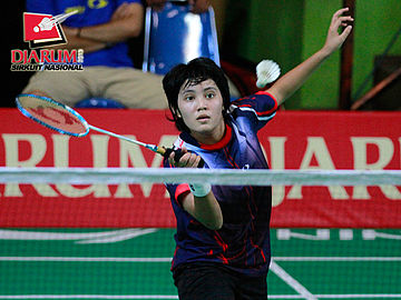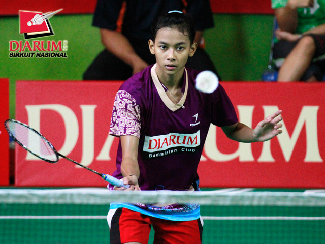 Dinar Dyah (PB Djarum) bersiap mengembalikan kok ke arah Elizabeth Purwaningthias (SGS PLN).