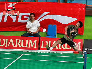 Alamsyah yunus (Pertamina Indonesia) melepaskan smash ke arah Fauzi Adnan (Jaya Raya Suryanaga).