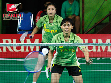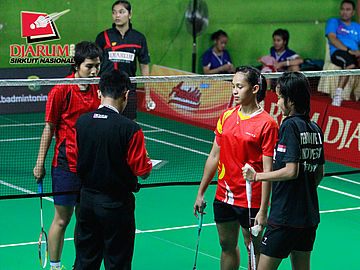 Masita Mahmudin/Afni Fadilah (Pusdiklat Jaya Raya/Indocafe) dan Febriani Endar/Ristya Ayu (PB Djarum) sebelum memulai pertandingan.