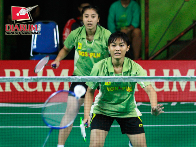 Dini Fitri/Inten Ratnasari (SGS PLN) melepaskan serve.