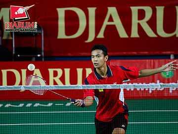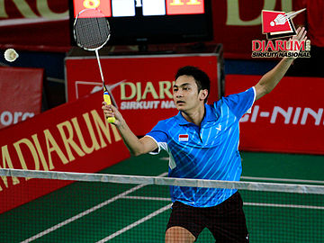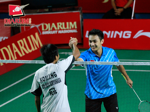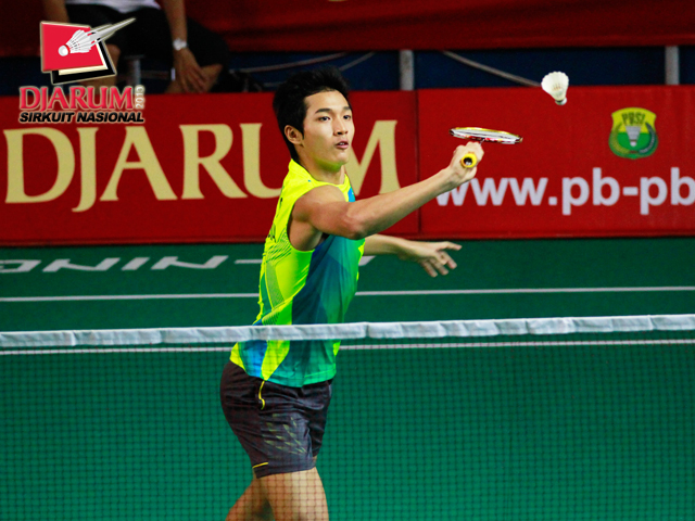 Jonathan Christie (Pelatnas) bersiap menyambar pengembalian tanggung dari Indra Setiawan (Pertamina Indonesia).