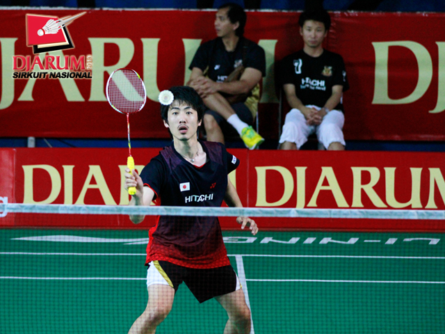 Shuhei Hayasaki (Hitachi Jepang) bersiap menghadang serangan yang dilepaskan Ryan Fajar (PB Djarum).