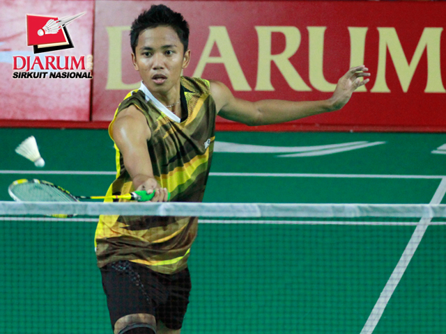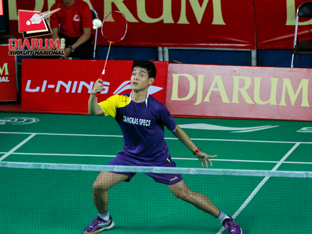 Topas Wismoyo (SGS PLN) mengembalikan kok ke arah M. Bayu Pangistu (Pelatnas).