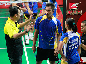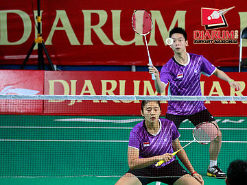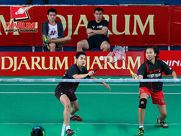 Rahmat Adianto/Deariska Putri (PB Djarum) menyambar pengembalian dari pasangan Ahmad Rivai/Aris Budiharti (Bank Sumsel/Jaya Raya).