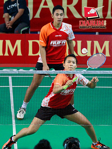 M. Tegar/Zakia Ulfa (Aufa) mengembalikan kok ke arah VickiAl-Denis/Monica Ngilu (Mutiara Bandung).