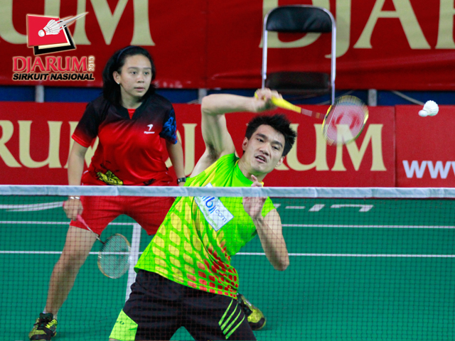 Rizko Asuro/Aneke Putri (Guna Dharma) menyambut serve dari Abu Bakar/Febriani Endar (PB Djarum).