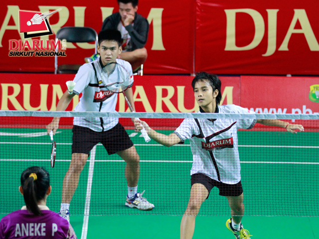 Pasangan ganda campuran taruna PB Djarum, Abu Bakar/Febriani Endar bersiap menyambut pengembalian dari Rizko Asuro/Aneke Putri (Guna Dharma).