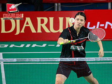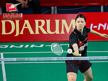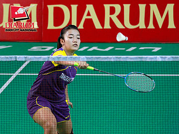 Sylvinna Kurniawan (PB Djarum) mengembalikan kok ke arah Mutiarani (SGS PLN).