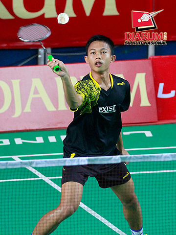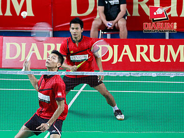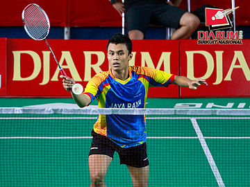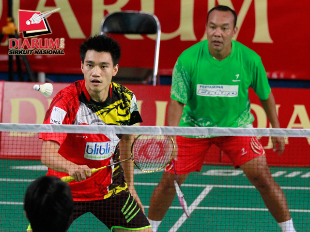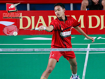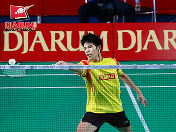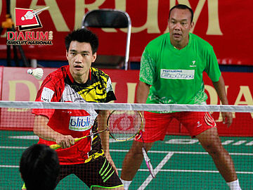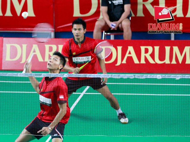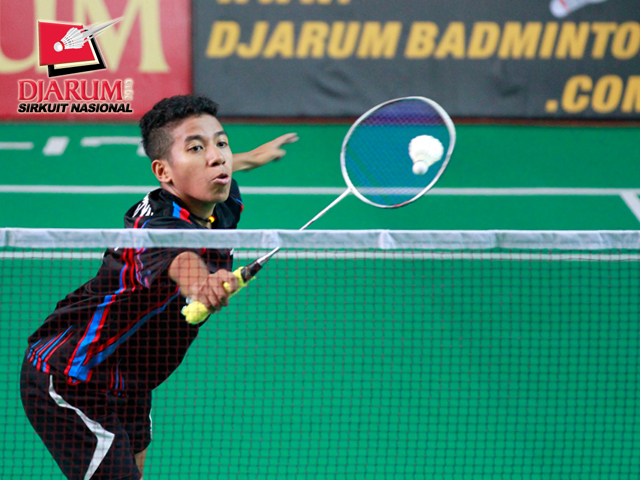 Andri Wijaya (PB Djarum) mengembalikan kok ke arah Faisal Prio (Jaya Raya).
