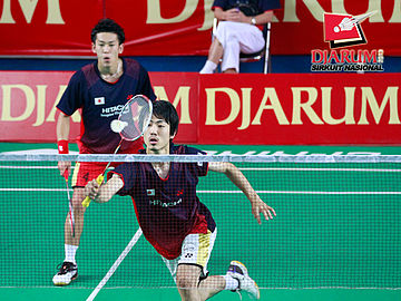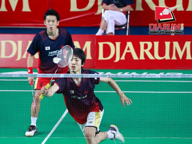 Shuhei Hayasaki/Tomoki Misuhashi (Hitachi Jepang) menyambut serve dari Didit Juang/Rahmat Adiyanto (PB Djarum).