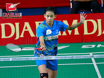 Dinar Dyah (PB Djarum) mengembalikan kok ke arah Elizabeth Purwaningtyas (SGS PLN).