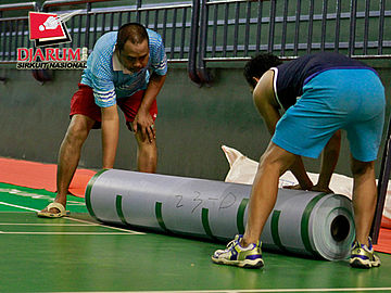 Seorang pekerja sedang mempersiapkan karpet lapangan di Hall Bulutangkis Asia Afrika.