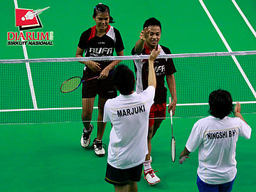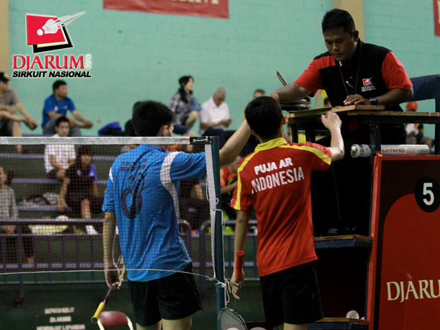 Puja Adria (SGS PLN) dan Tan Lin Bin (Neba Malaysia) tampak sedang bersalaman dengan wasit di akhir pertandingan.