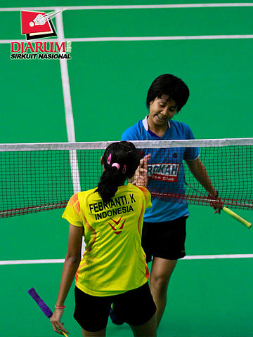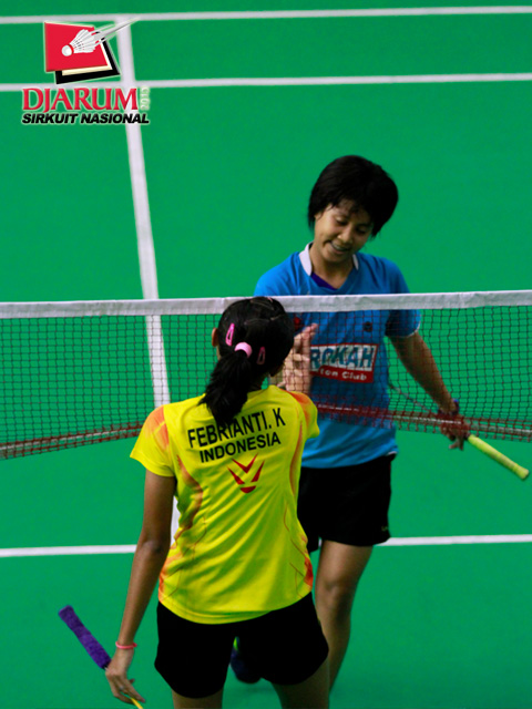 Deha Riska (Barokah) berjabat tangan seusai pertandingan dengan Kristiyana Febriyanti (Akademi Bad. Yani Kaltim).
