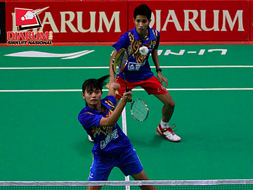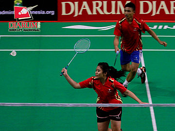 Denny Surya Pranata/Fitria Ayu Nawang Wulan mengembalikan kok ke arah lawan.