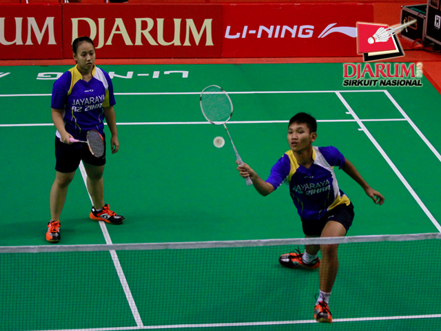 Pasangan ganda Satria Agum/Zayena R berusaha mengejar kok.