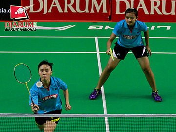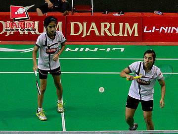 Febriani Endar Kusumawati/Ristya Ayu Nugraheni (Djarum Kudus) mengembalikan kok ke arah Novi Darmayanti/Widya Tiffani (Candra Wijaya/Tangkas Specs).