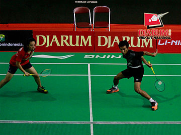 Ahmad Rivai/Aris Budiharti (Bank sumsel/Jaya Raya Jakarta) mencoba mengembalikan kok ke arah Ryo Arief/Aan D C (Hiqua Wima).