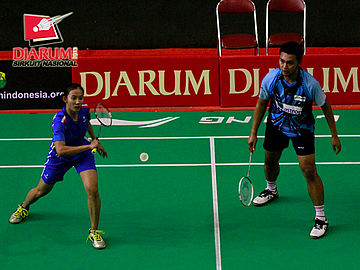 Adriansyah Putra/Devi Tika Permatasari (Pertamina Indonesia/SGS PLN) bersiap mengembalikan smash dari Bambang Saefulloh/Mia Kurnia H (SGS PLN).