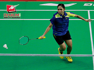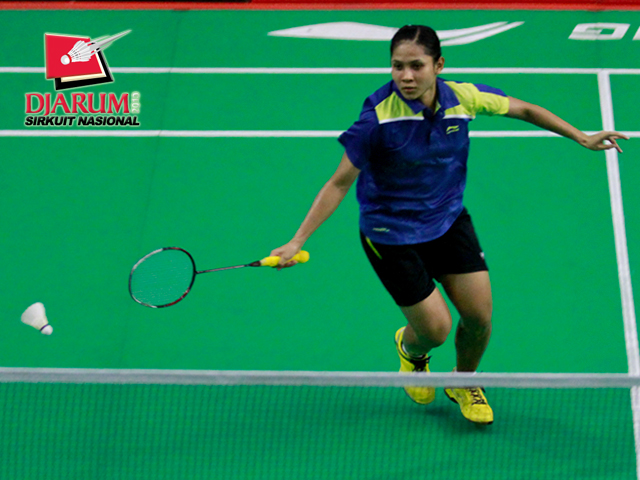 Melisa Andesti (Djarum Kudus) berusaha menggapai kok.