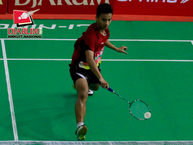 Christeven Howard (Candra Wijaya) berusaha menyambar kok ke arah Sandy Agusliansyah (Exist Jakarta).