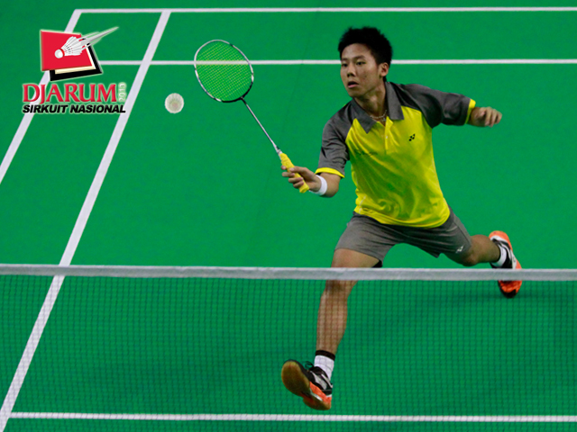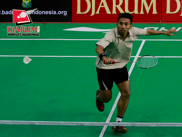Yoga Sidik (Pelatrov PBSI DKI Jakarta) berusaha menyambar kok ke arah Moch Revindra Rayhaldi (Djarum Kudus).