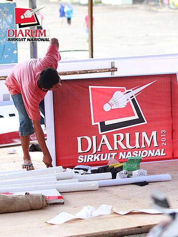 Salah satu pekerja sedang memasang banner Djarum Sirkuit Nasional Li-Ning Lampung Open 2013.