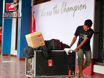 Seorang pekerja membawa perlengkapan dekorasi di GOR Saburai, Bandar Lampung.
