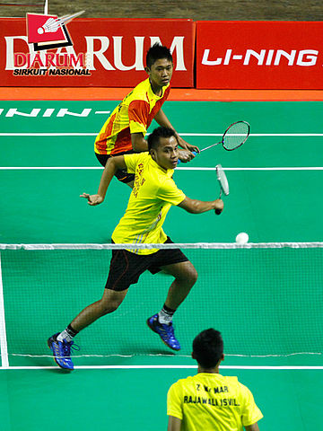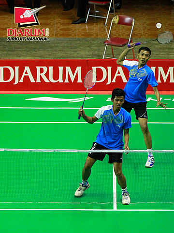 Adimas Aglasia/Wisnu Prestian (Lambar) bersiap mengembalikan kok ke araj pasangan Agung/Solihin (Sejahtera).
