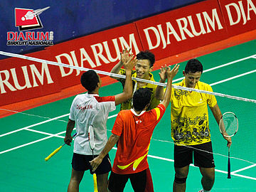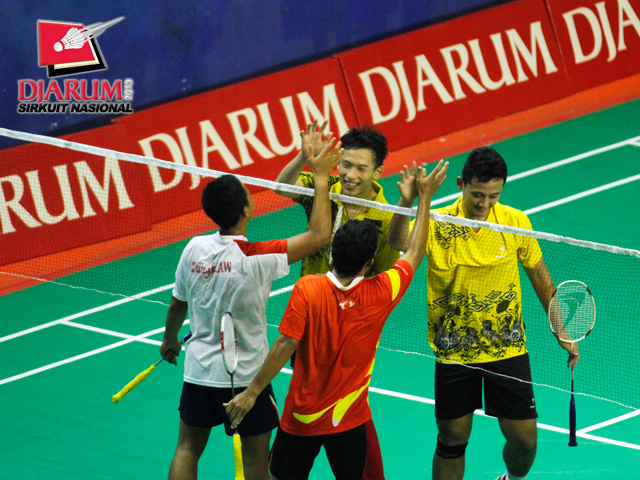 Pasangan ganda dewasa putra Srikandi, Apri DK/Tungki AW bersalaman dengan Hardianto/Setya Jaya (Tangkas Specs/Kaliki Spirit) usai bertanding.