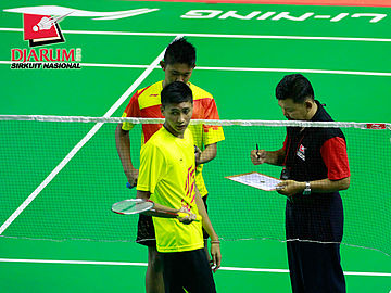 M. Iqbal Maryanto/Noval Riyanto (Gemilang Surabaya) saat berbincang dengan wasit sebelum bertanding.